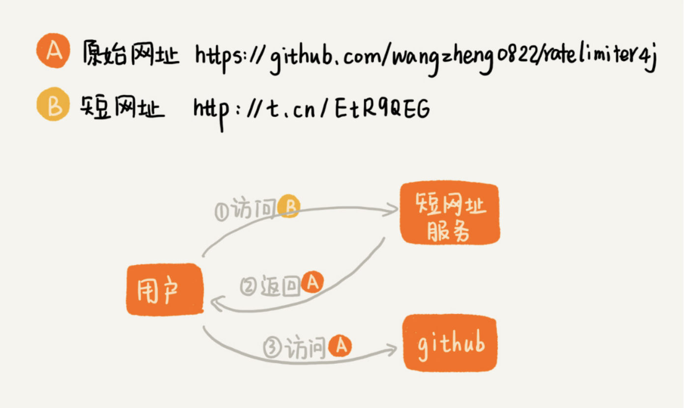从图中我们可以看出,浏览器会先访问短网址服务,通过短网址获取到原始网址,再通过原始网址访问到页面。不过这部分功能并不是我们今天要讲的重点。我们重点来看,如何将长网址转化成短网址?