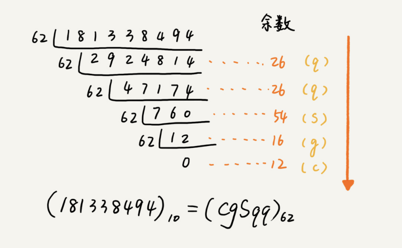 不过,你可能已经看出来了,通过 MurmurHash 算法得到的短网址还是很长啊,而且跟我们开头那个网址的格式好像也不一样。别着急,我们只需要稍微改变一个哈希值的表示方法,就可以轻松把短网址变得更短些。