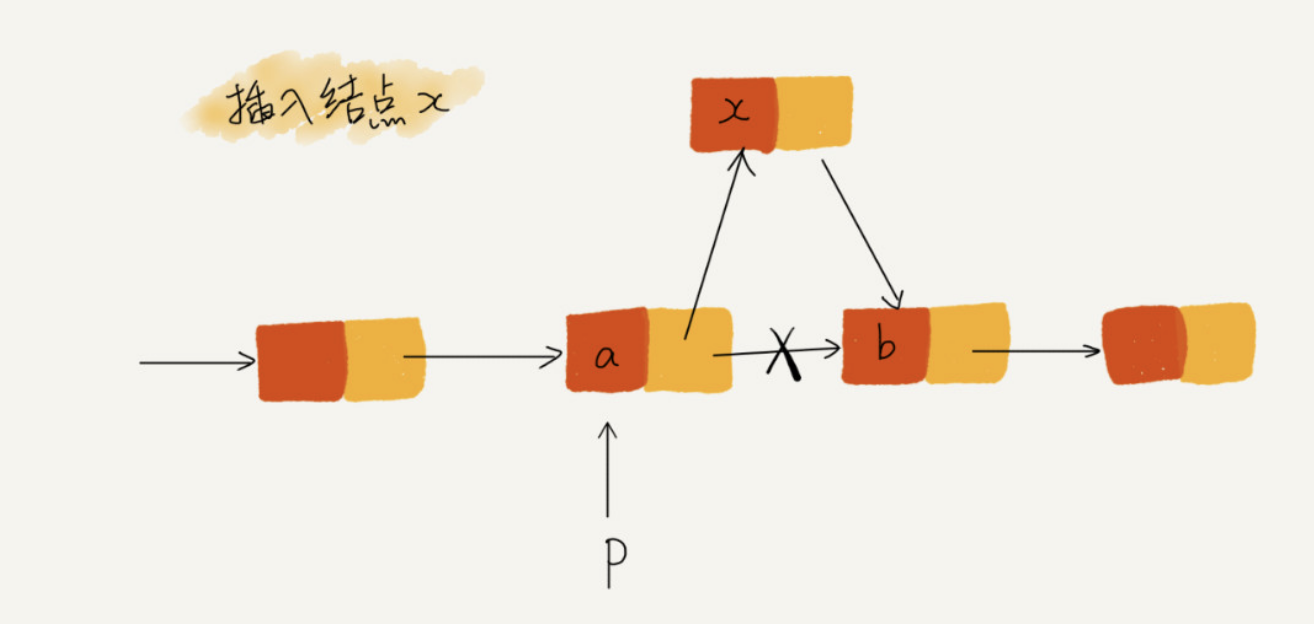 x->next = p->next; // 将 x 的结点的 next 指针指向 b 结点;