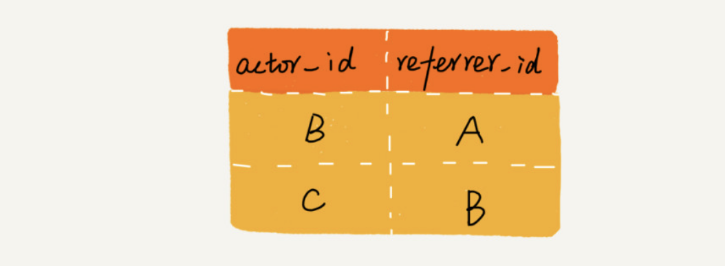 一般来说,我们会通过数据库来记录这种推荐关系。在数据库表中,我们可以记录两行数据,其中 actor_id 表示用户 id,referrer_id 表示推荐人 id。