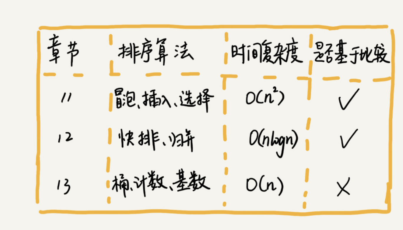 排序算法太多了,有很多可能你连名字都没听说过,比如猴子排序、睡眠排序、面条排序等。我只讲众多排序算法中的一小撮,也是最经典的、最常用的:冒泡排序、插入排序、选择排序、归并排序、快速排序、计数排序、基数排序、桶排序。我按照时间复杂度把它们分成了三类,分三节课来讲解。