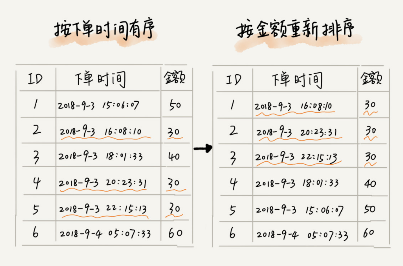 比如说,我们现在要给电商交易系统中的“订单”排序。订单有两个属性,一个是下单时间,另一个是订单金额。如果我们现在有 10 万条订单数据,我们希望按照金额从小到大对订单数据排序。对于金额相同的订单,我们希望按照下单时间从早到晚有序。对于这样一个排序需求,我们怎么来做呢?