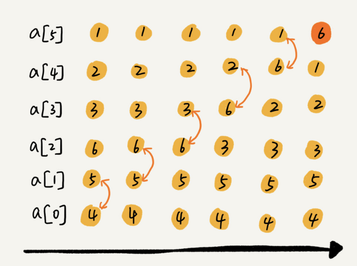 可以看出,经过一次冒泡操作之后,6 这个元素已经存储在正确的位置上。要想完成所有数据的排序,我们只要进行 6 次这样的冒泡操作就行了。