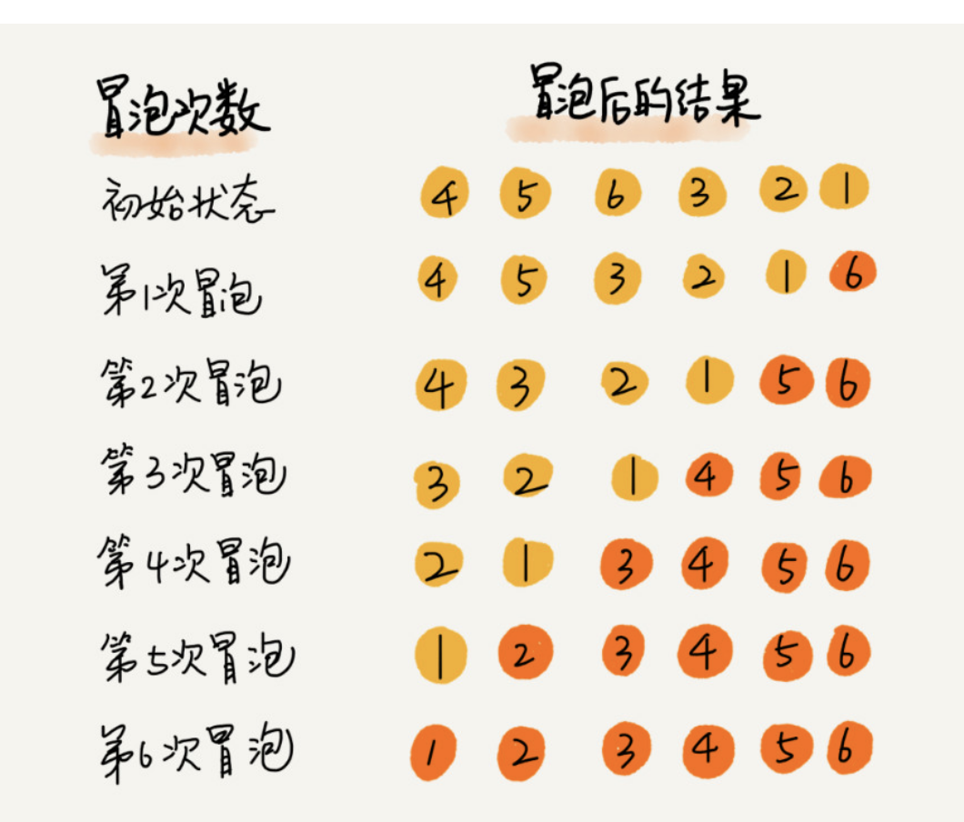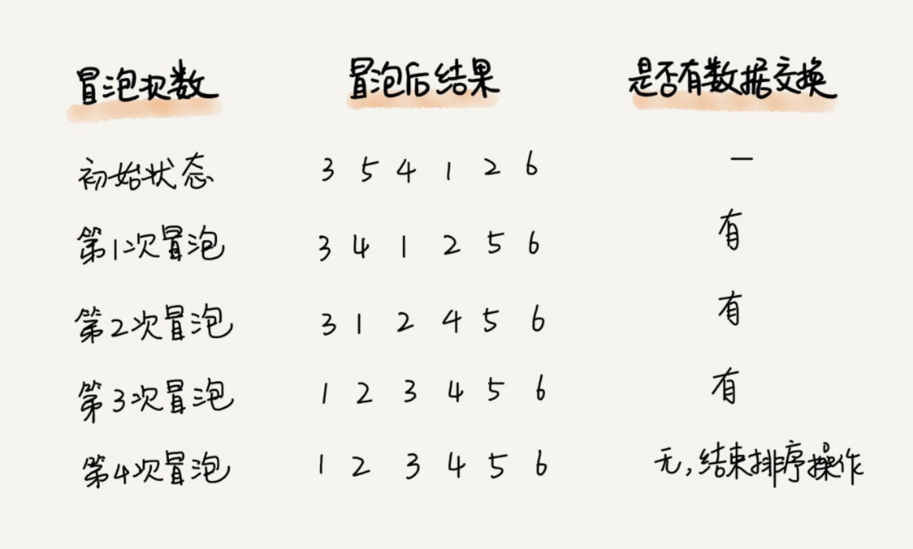 实际上,刚讲的冒泡过程还可以优化。当某次冒泡操作已经没有数据交换时,说明已经达到完全有序,不用再继续执行后续的冒泡操作。我这里还有另外一个例子,这里面给 6 个元素排序,只需要 4 次冒泡操作就可以了。