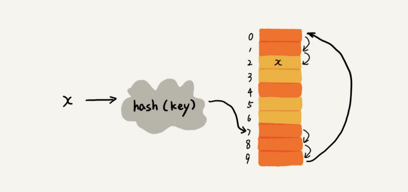 从图中可以看出,散列表的大小为 10,在元素 x 插入散列表之前,已经 6 个元素插入到散列表中。x 经过 Hash 算法之后,被散列到位置下标为 7 的位置,但是这个位置已经有数据了,所以就产生了冲突。于是我们就顺序地往后一个一个找,看有没有空闲的位置,遍历到尾部都没有找到空闲的位置,于是我们再从表头开始找,直到找到空闲位置 2,于是将其插入到这个位置。