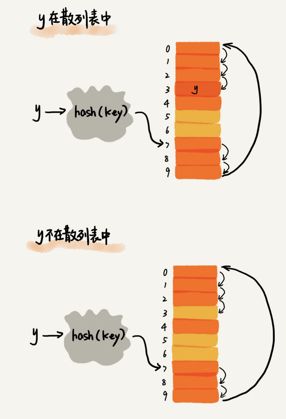 我说的可能比较抽象,我举一个例子具体给你说明一下。这里面黄色的色块表示空闲位置,橙色的色块表示已经存储了数据