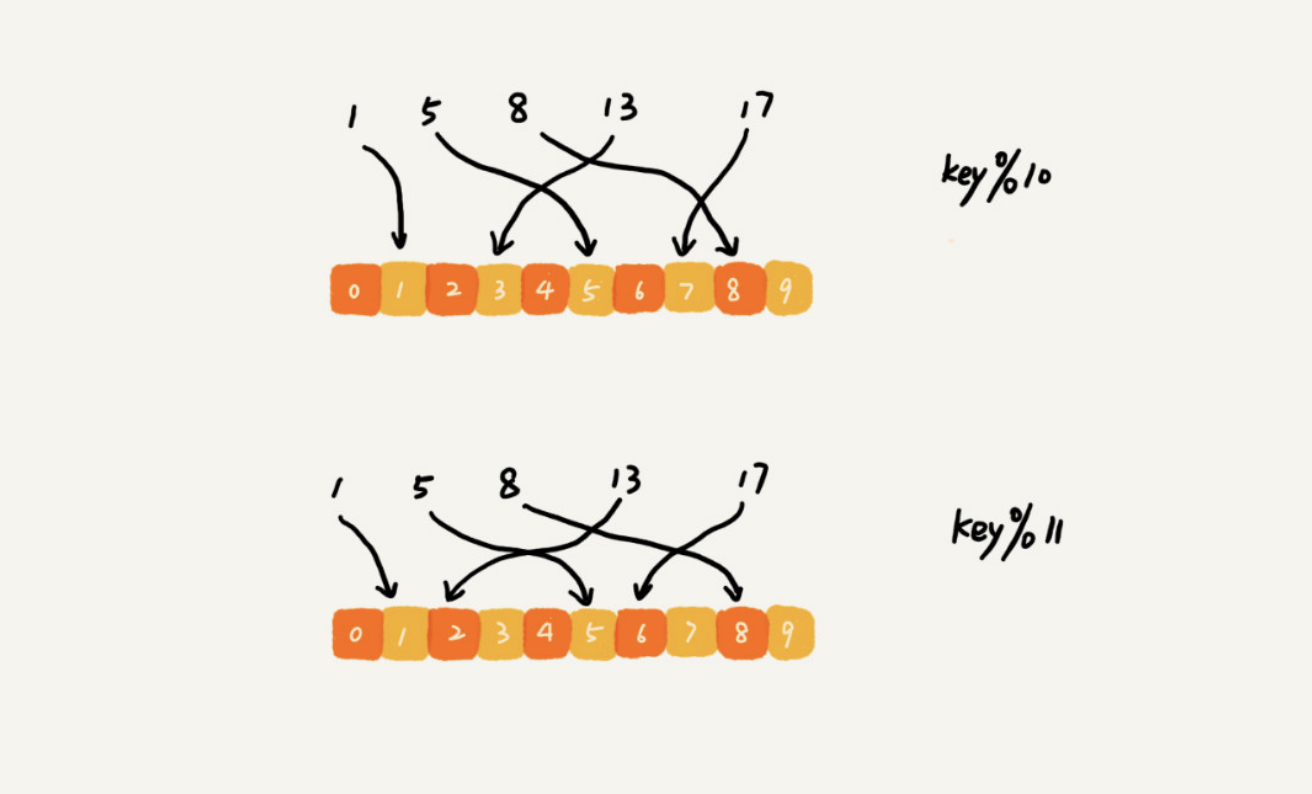 但是,如果数据增多,原来的 10 个机器已经无法承受了,我们就需要扩容了,比如扩到 11 个机器,这时候麻烦就来了。因为,这里并不是简单地加个机器就可以了。