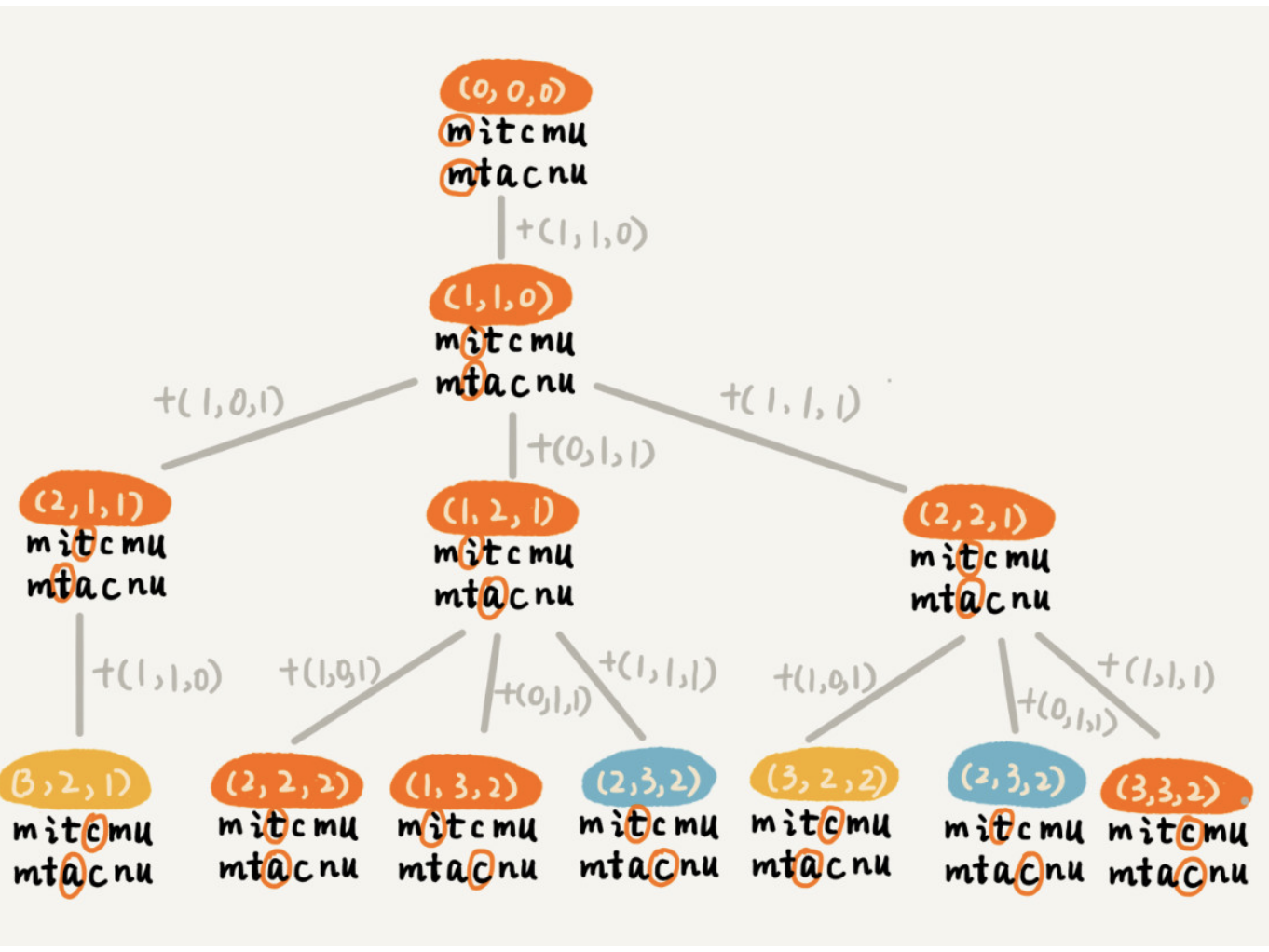 在递归树中,每个节点代表一个状态,状态包含三个变量 (i, j, edist),其中,edist 表示处理到 a[i] 和 b[j] 时,已经执行的编辑操作的次数。