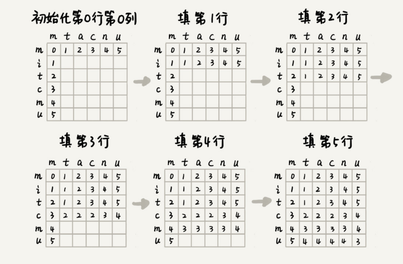 其中,min 表示求三数中的最小值。 了解了状态与状态之间的递推关系,我们画出一个二维的状态表,按行依次来填充状态表中的每个值。
