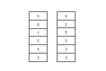 以数据[3,4,2,7,9,0]为例,让这组数字依次如栈,则栈和其对应的最小值栈如下:
