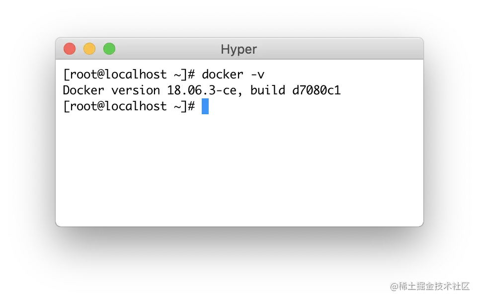 接着执行一下 docker -v ,这条命令可以用来查看 Docker 安装的版本信息。当然也可以帮助我们查看 docker 安装状态。如果正常展示版本信息,代表 Docker 已经安装成功。