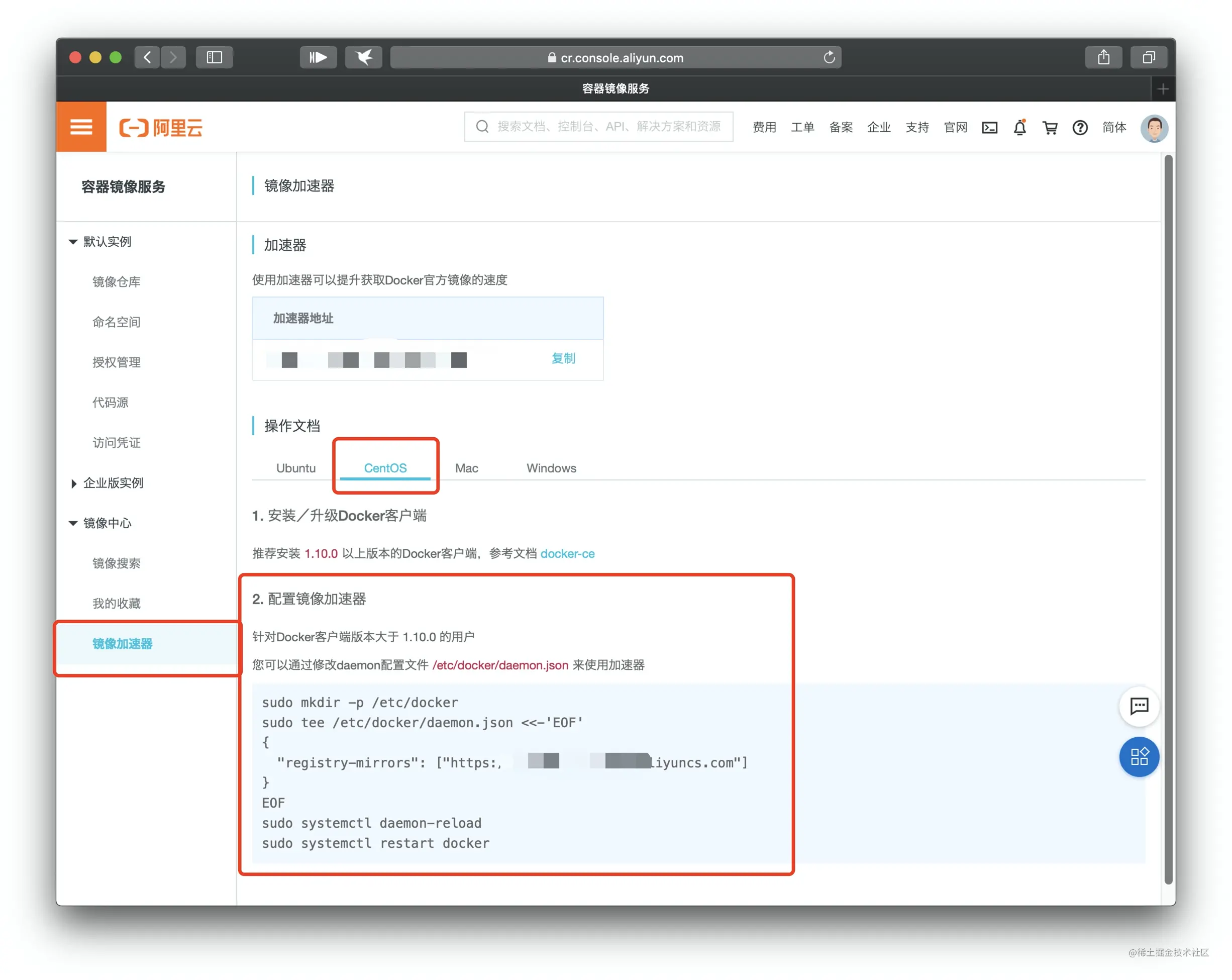 - 登录阿里云官网,打开 阿里云容器镜像服务。点击左侧菜单最下面的 镜像加速器 ,选择 CentOS (如下图)。按照官网的提示执行命令,即可更换 docker 镜像源地址。