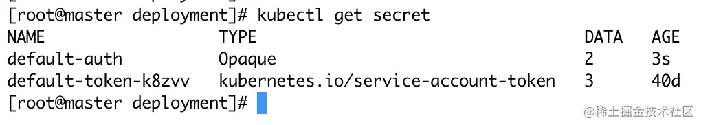 - 存储成功后,我们可以通过 kubectl get secret 命令来查看你存储过的 Secret。在这里可以看到,刚刚创建的密钥组合 default-auth 已经展示了出来。