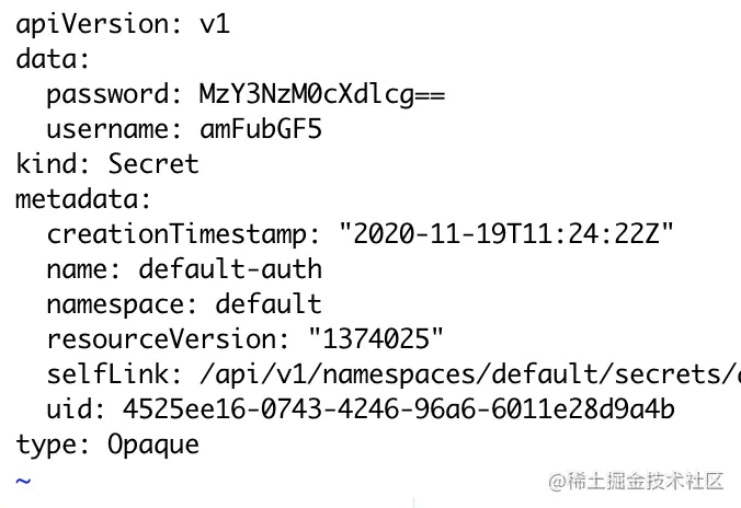 我们可以通过 kubectl edit secret 命令来编辑 default-auth 的内容,来看看里面到底存了什么内容: