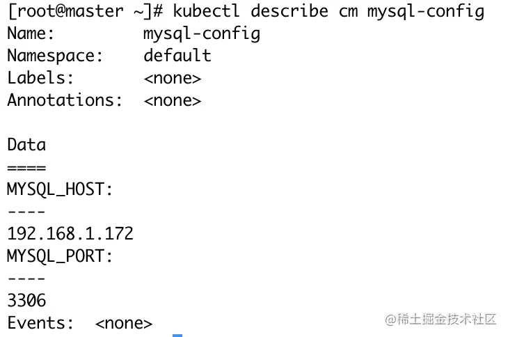 可以看到,上面的就是我们刚创建的 ConfigMap。里面的 DATA 为 2 ,代表有 2 条数据存在。我们直接使用 kubectl describe cm mysql-config 即可查看下这个 ConfigMap 的具体信息:
