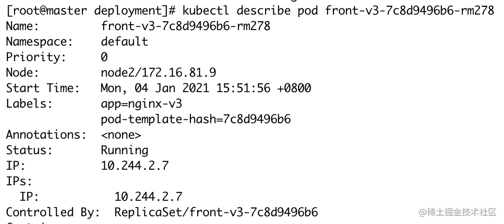 随后,我们用 kubectl get pods 命令获取Pod列表,用 kubectl describe pod 命令看下 Pod3 的运行详情: