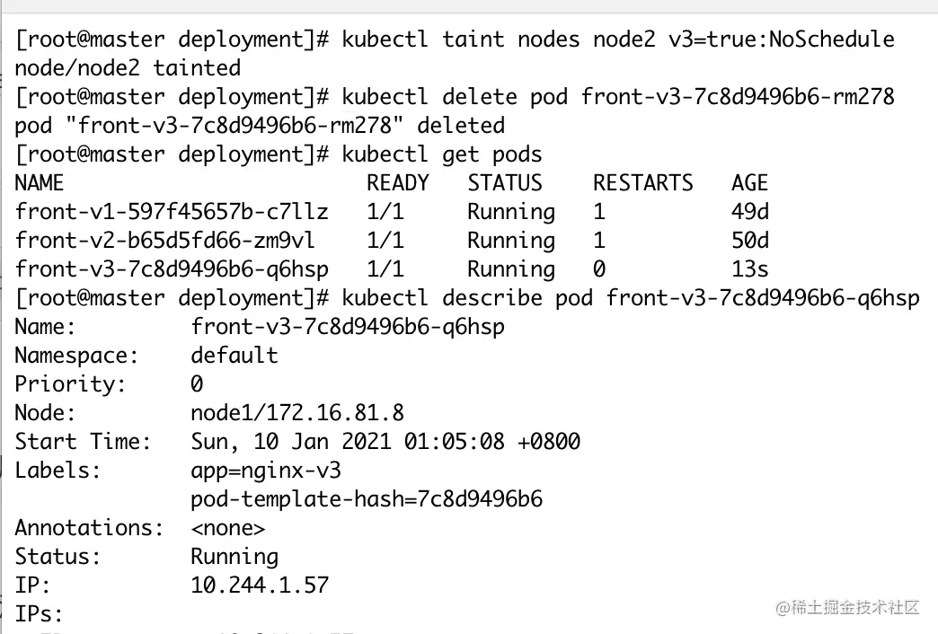 我们删除掉已经创建的 v3 版本的 Pod ,让 Kubernetes 重建 Pod ,看看新 Pod 还会不会被调度到 node2 上面去: