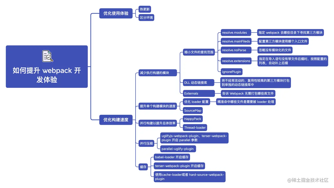 本篇文章我们先来看一下如何优化提升 webpack 的开发体验,优化开发体验主要目的是提升开发效率,让我们不必要每次要去抽一支烟才能等到项目启动或者构建完成。同时,也需要使用工程化的手段避免重复性劳动。下面是本篇文章的脑图(赶紧右键保存下来(づ。◕‿‿◕。)づ)