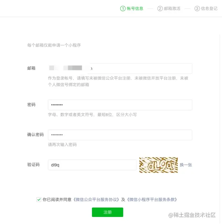 先准备一个没有注册过公众号的邮箱,然后访问小程序介绍页面并点击底部的「前往注册」按钮,再按照提示填写个人信息,最后进入邮箱激活账号即可。