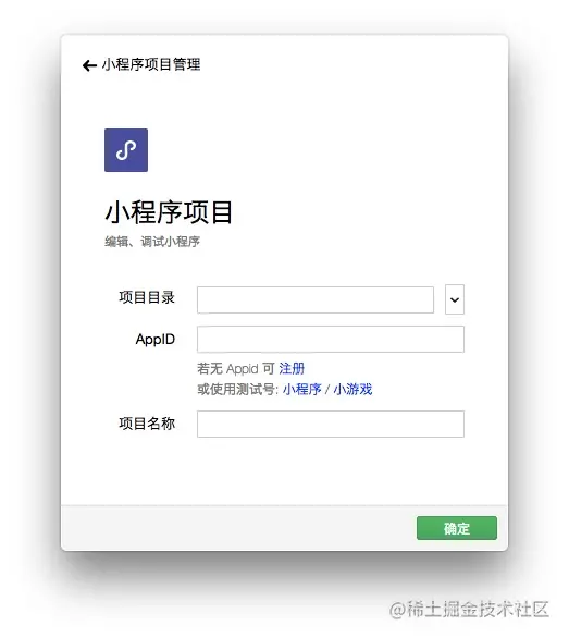 打开开发者工具,使用注册时绑定的微信账号扫码登录,这时在进入的界面中选择「小程序项目」,如果是初次使用小程序开发者工具,没有创建过小程序项目,就会进入下面的页面: