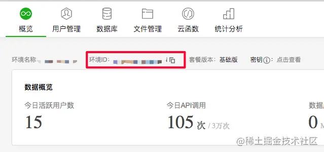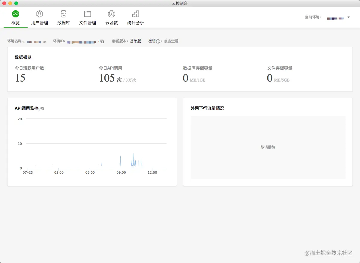 首页会看到一些 API 调用和小程序·云开发的资源配置信息。