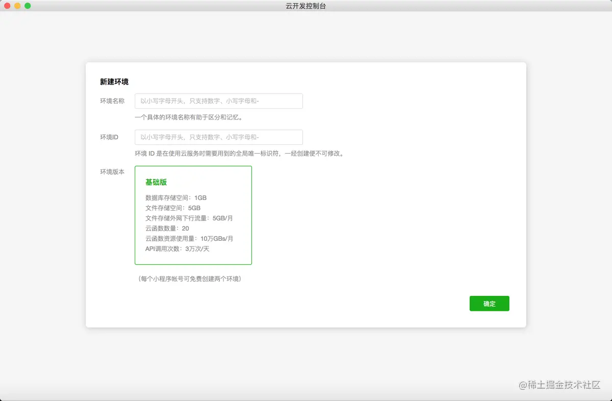 TIPS:目前一个小程序账号可以免费开通两个云开发账号,免费版本的限制应该也要注意: