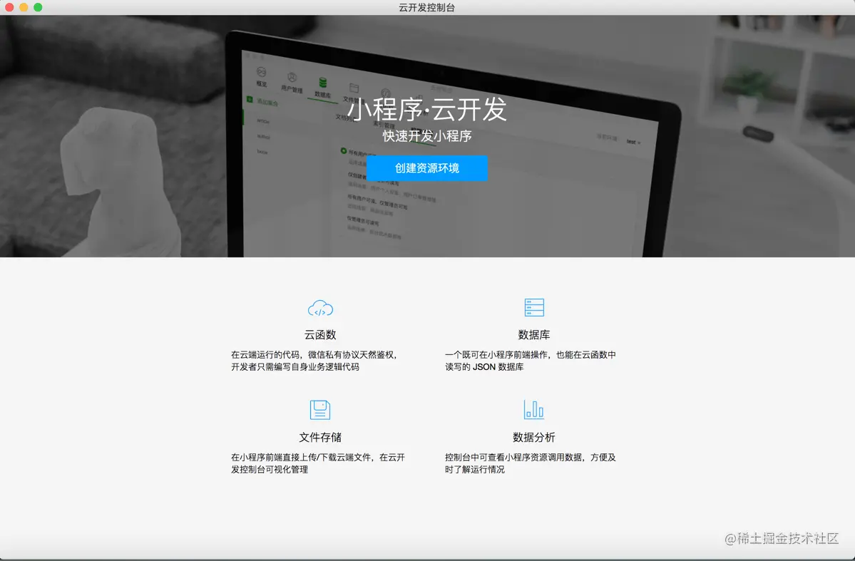 如果还没有开通小程序·云开发账号,首次点击「云开发」会出现下面的界面,该界面主要是云开发的介绍和申请入口。