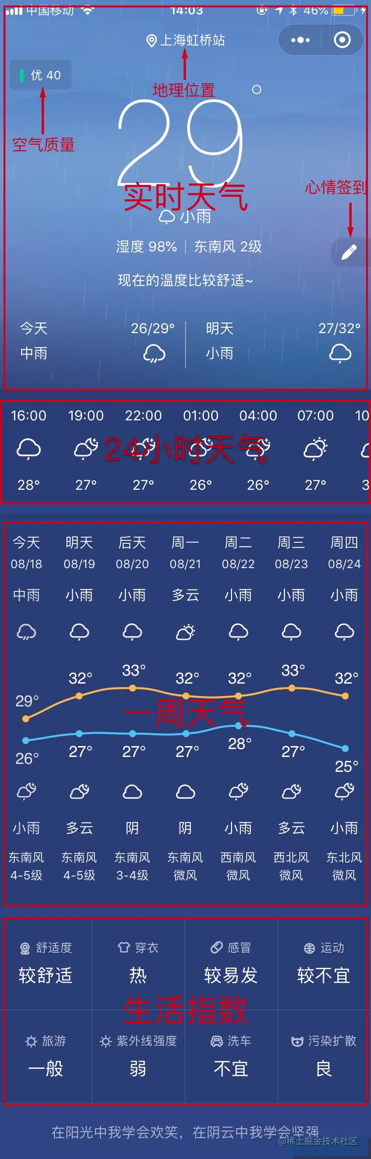 • 实时天气预报:这块页面元素较多,页面复杂度高,其中顶部定位模块有事件绑定,右侧签到入口有「心情签到」页面入口;除此之外,在雨雪天气整个区域还会有雨雪动效,动效是使用小程序的绘图 API 实现的粒子系统