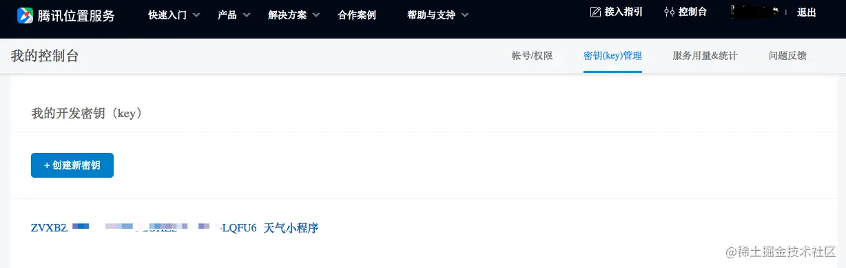 首先在腾讯地图开放平台注册账号,注册后登录,在「我的控制台 -> 密钥(key)管理」中可以添加密钥。密钥是我们使用 API 必须传递的一个参数,每个不同的应用对应不同的密钥。