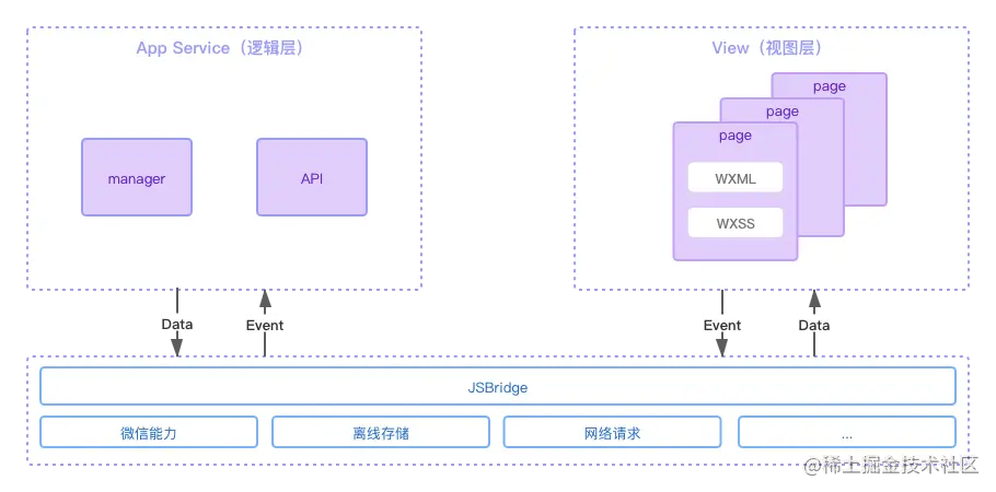 微信小程序的渲染层与逻辑层分别由两个线程管理,渲染层的界面使用 webview 进行渲染;逻辑层采用 JSCore运行JavaScript代码。这里先看一下小程序的架构图。