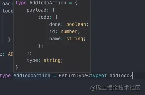 由于在后面的 reducer 中我们需要函数返回的 Action 类型,所以我们得取得每个 action 函数的返回类型,其实这里有一个技巧,就是利用 TypeScript 强大的类型推导来反推出类型,我们可以先定义函数,再推导出类型。
