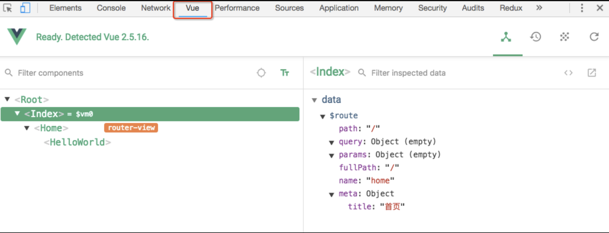 成功安装它之后,在 Vue 项目的页面中我们可以打开 Chrome 控制台选择 Vue 的 tab 进行页面调试。