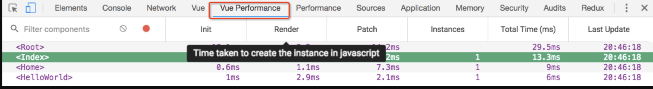 同样安装完毕后,我们可以打开 Chrome 控制台选择 Vue Performance 的 tab 进行组件的性能观察。