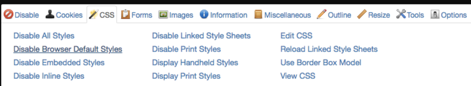 Web Developer 是一款强大的用于操作网页中各项资源与浏览器的插件,比如一键禁用 JS、编辑 CSS、清除 Cookie 等。