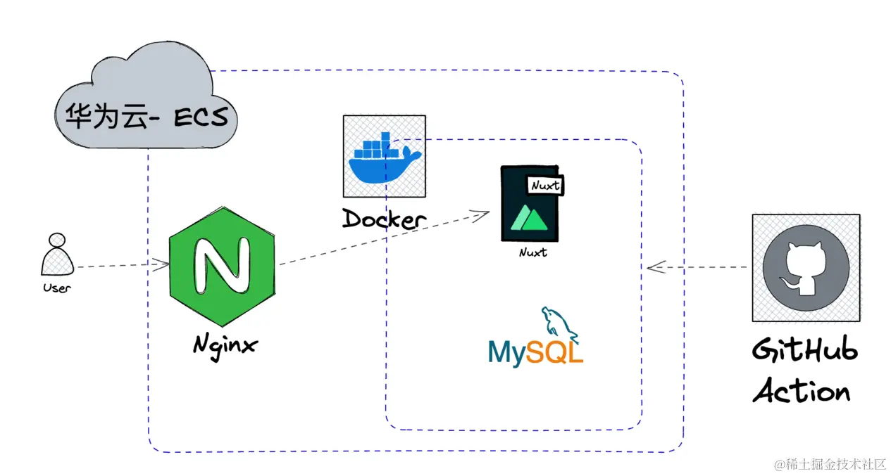 我们将制作一个 Docker 镜像把 Nuxt 作为 Web 服务一部分封装起来,然后和原先开发环境中的 MySQL 和 adminer 编排在一起。