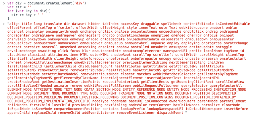 Virtual DOM 这个概念相信大部分人都不会陌生,它产生的前提是浏览器中的 DOM 是很“昂贵"的,为了更直观的感受,我们可以简单的把一个简单的 div 元素的属性都打印出来,如图所示: