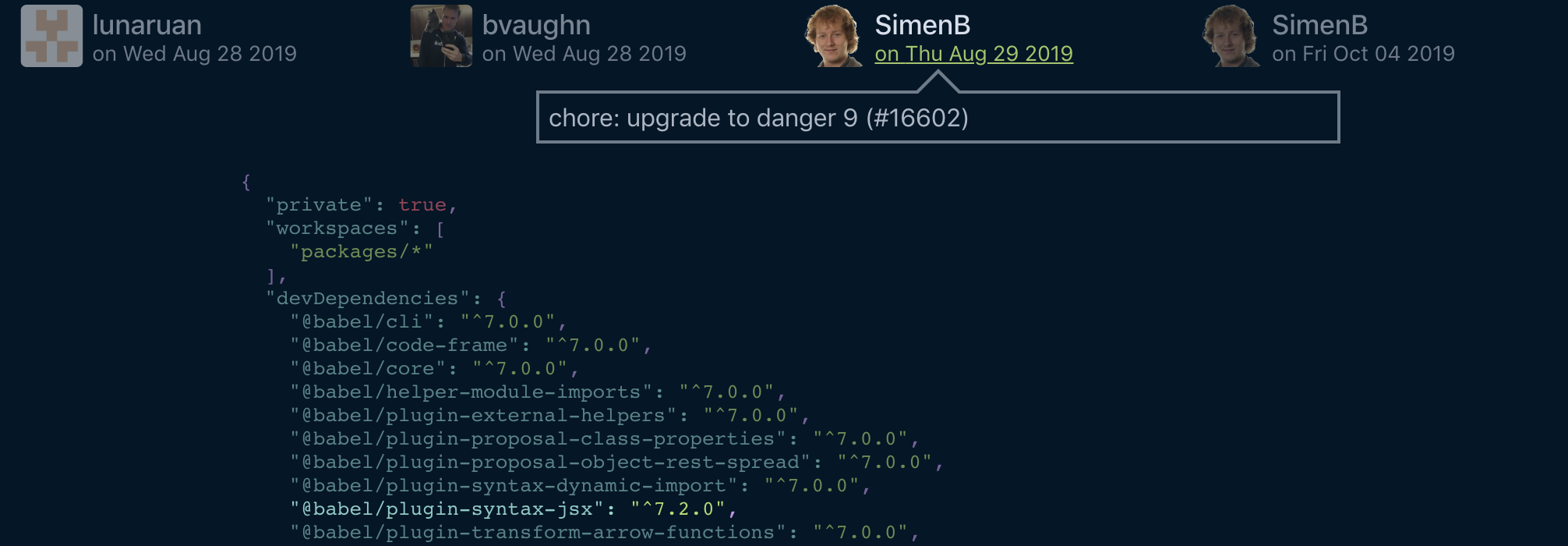 点击按钮跳转到更清晰的 git 历史页面,展示该文件的历史变更情况。相比直接使用 git log ,这种方式更友好。